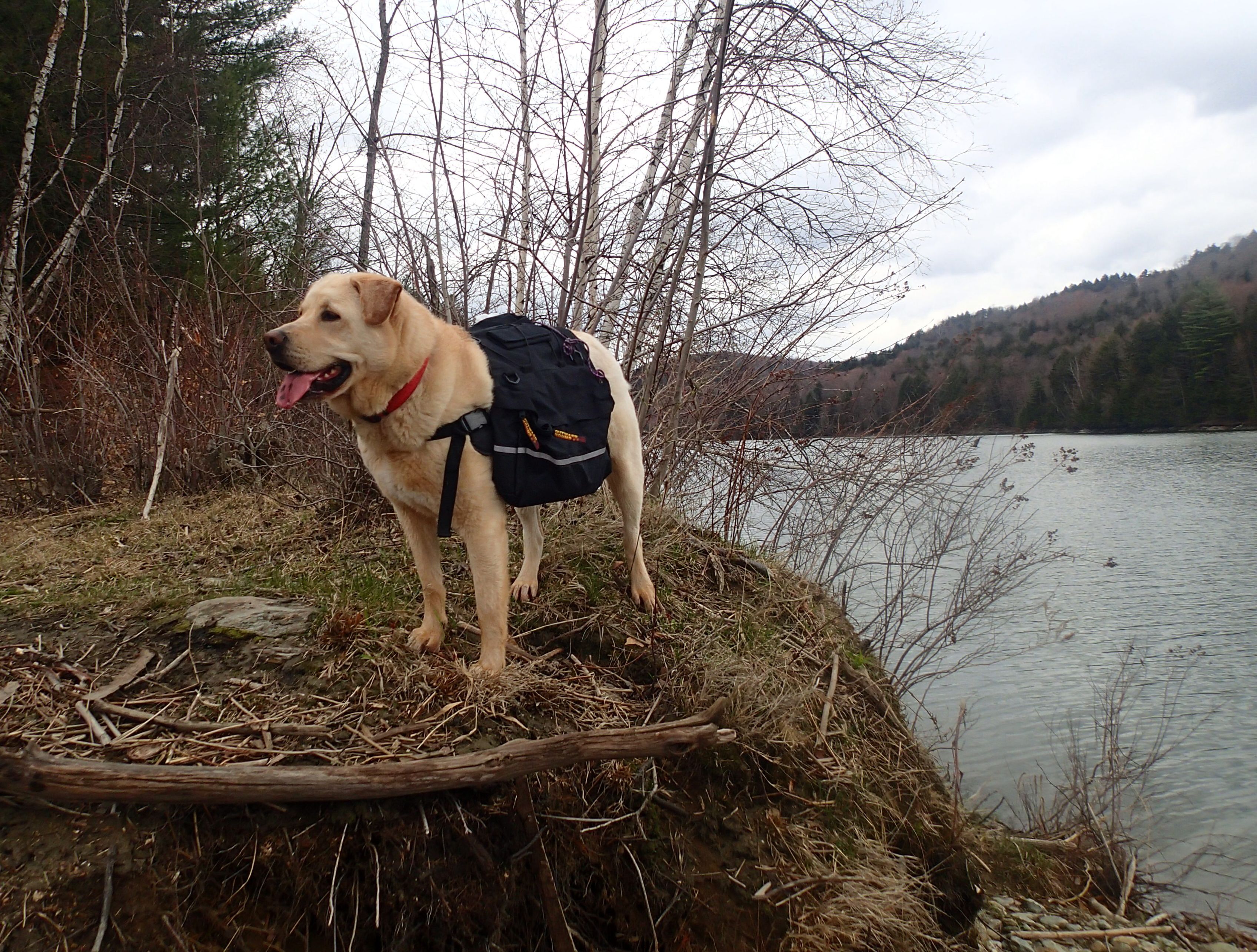The Paddle Pups participated in some community service today. The first Saturday in May is “Green-Up” day in Vermont…where volunteers go out and clean up the debris, trash, and garbage left behind by mother nature, or inconsiderate litter pigs. We headed out to help clean up the Waterbury Reservoir, one of our frequently visited canoeing and camping spots. The newly activated Friends of the Waterbury Reservoir has coordinated with the Rozalia Project, to monitor and collect data on trash issues on this heavily used recreational waterway. Gryphon was our trash hauler, wearing his backpack so we didn’t have to carry the debris we found! We collected miscellaneous debris ( sandal, water bottle, lots of broken glass, foam, plastic, Skoal cans, etc….), and it will be interesting to see how much trash is collected there as we make return visits during the summer.