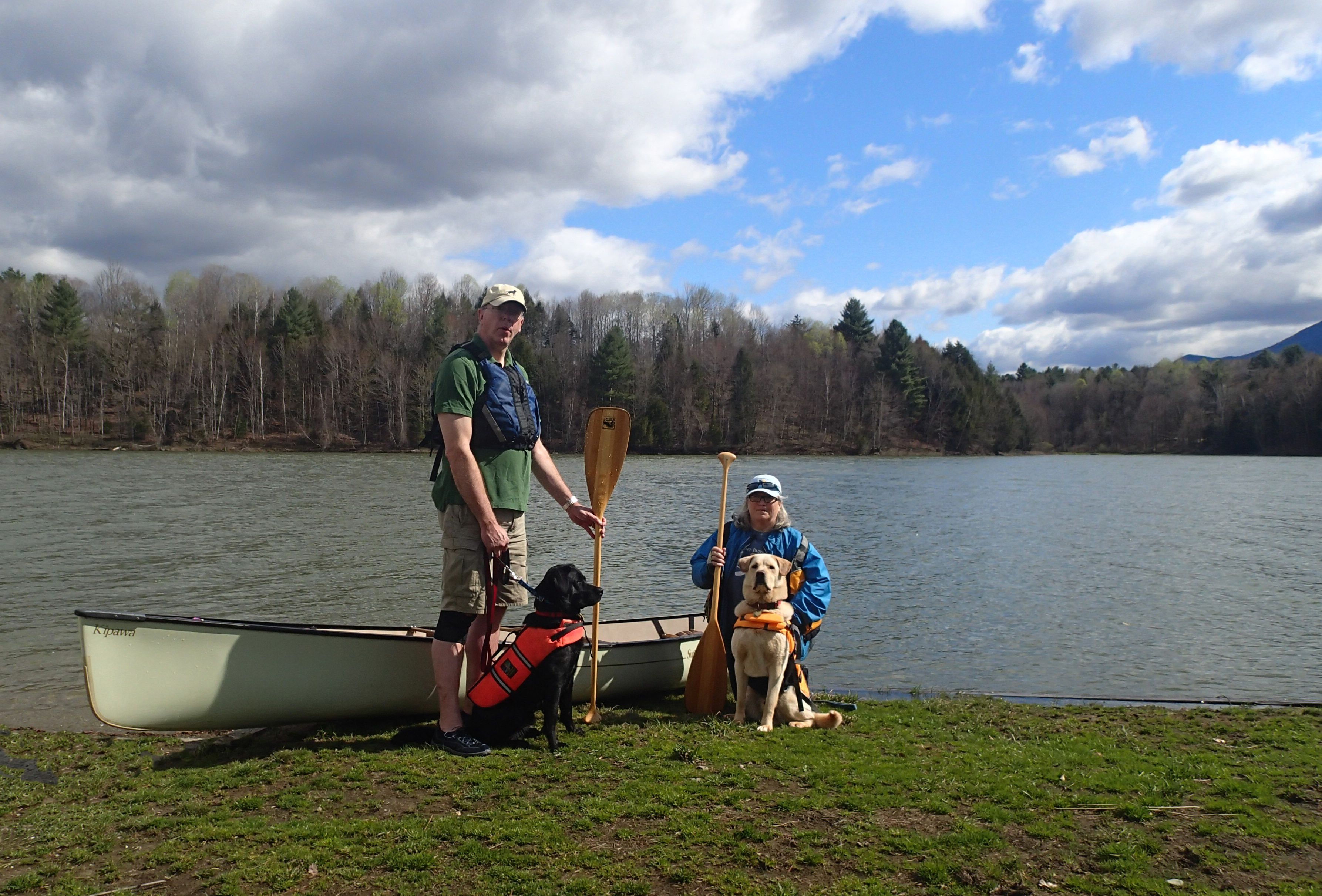 Yes, MAY, the lovely month of MAY! With the Irish canoe blessing in our heads ( watch over us, St, Brendan, patron saint of canoeists), we prep for the upcoming season. The PFDs and day trip gear is out of storage, the paddles are coming down from their winter display position, the NuFinish and Tung Oil are ready for pre-season application, and within 2 weeks, we should be heading out on the water. The American Canoe Association safety standards indicate that we have about 10-15 more degrees of water temp to go, before we can safely paddle without dry suits. The dogs were bouncy with anticipation when they saw their PFDs for the first time in 6 months. Maybe their doggy brains realize this means no more snow!