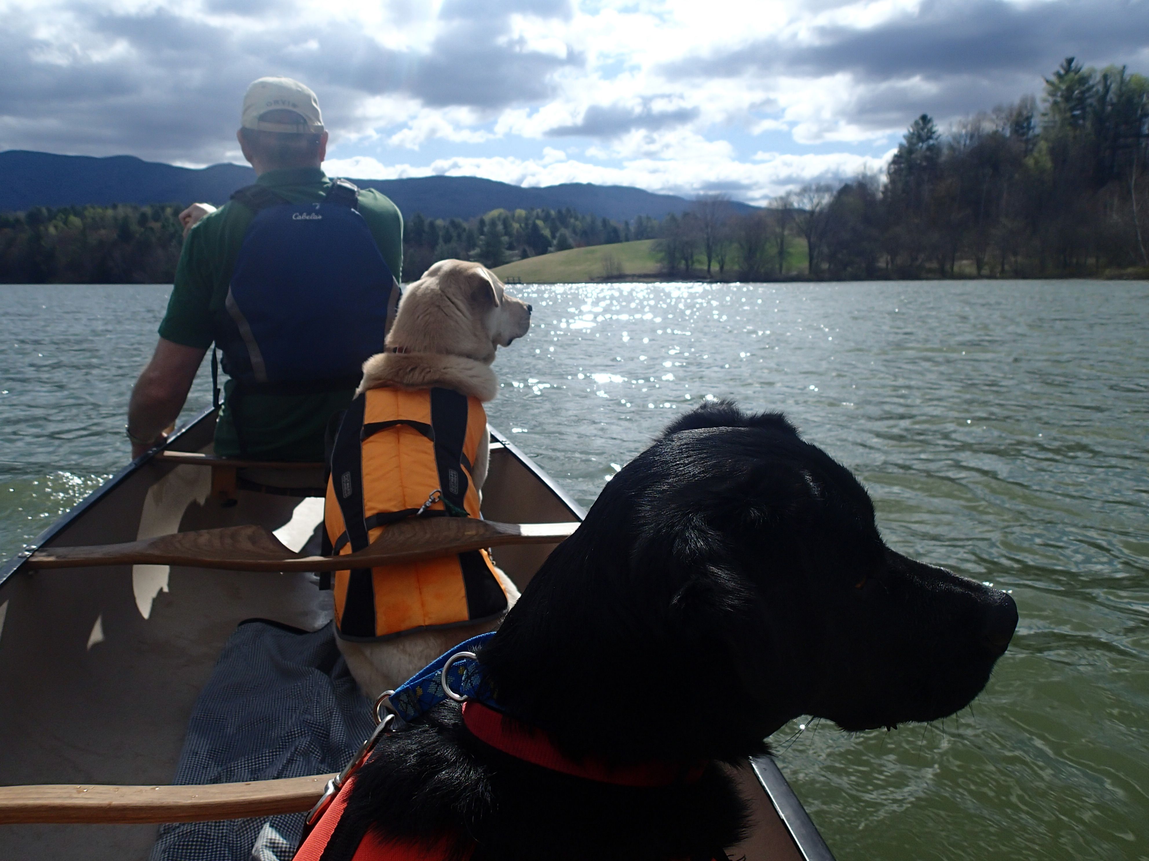 The dogs are excited to put on their PFDs, and we remember nearly all our gear ( the item we forgot is not critical for comfort or safety!). There is a 1/3 mile carry to the launch site, so we are able to put our new canoe dolly ( a Christmas gift) to the test. The dolly works great, and we easily reach our destination. We manage to get all of us into the canoe without any issues, and head out into the choppy water. We stay close to shore, and keep it a short paddle; as whitecaps begin to be seen,we decide to head in to shore. This was a great start to the paddling season, and has really fueled our enthusiasm!