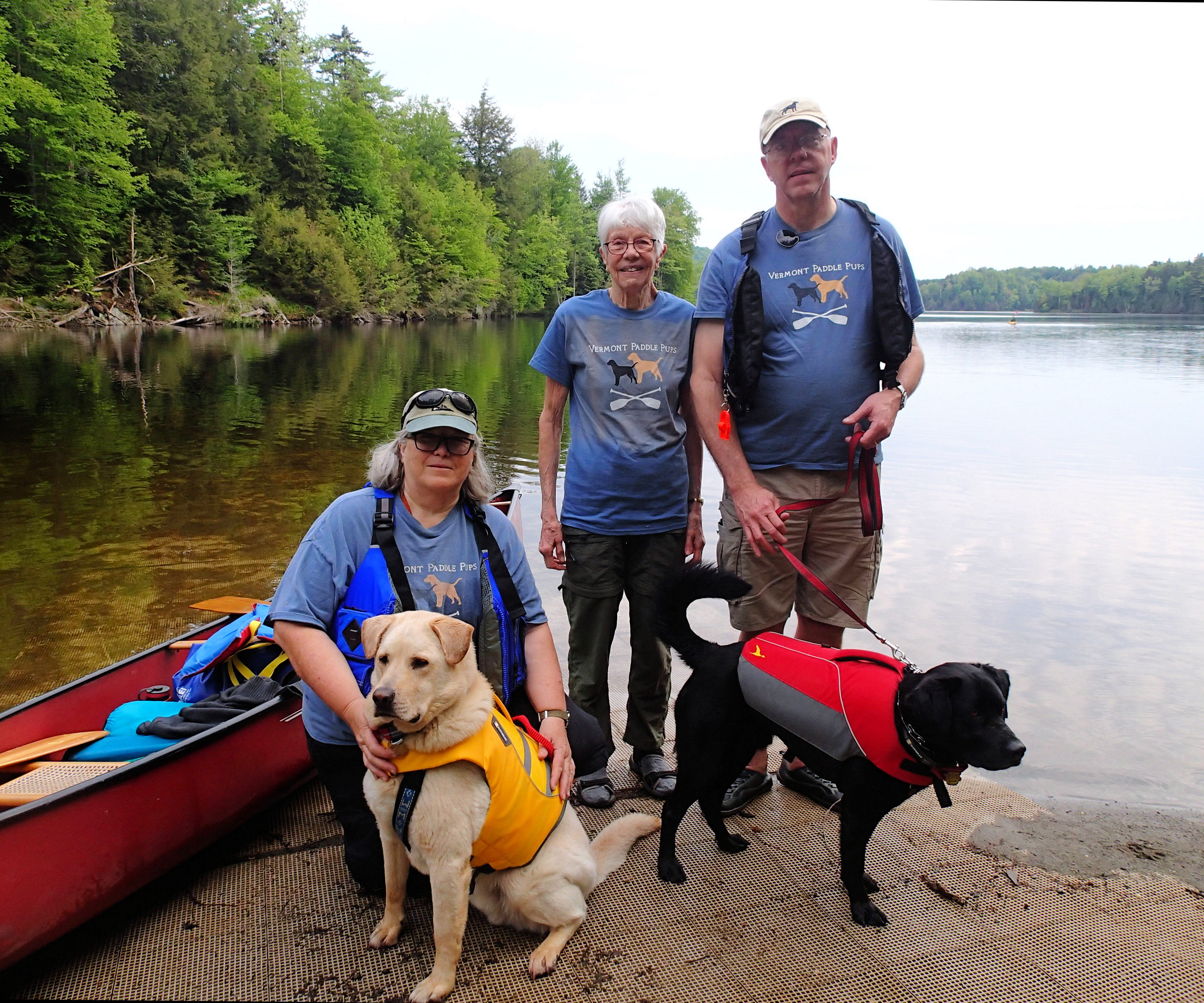 We managed to get out early the next morning , arriving at the take-out area just as a few sprinkles began to fall. We did manage to get a photo of “Team Vermont Paddle Pup” the only photo in existence of 3 people wearing our VPP shirts (because we own all 3 shirts, and this is the first time we paddled together in them!)